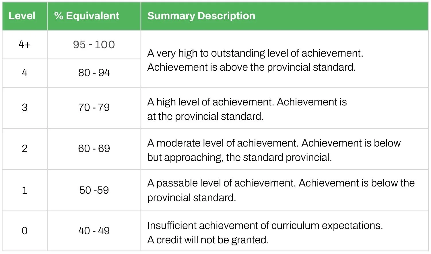 Some tasks are assessed ‘for’ learning or as the learning is in process. Such tasks allow students to attempt new skills and demonstrate recent learning without their performance affecting their overall grade, such as quizzes and exit cards. Only tasks that are designed to involve assessments ‘of’ learning, such as essays, tests, oral presentations and exams contribute to a student’s overall course grade. Student performance is evaluated in terms of criteria that is presented to the students ahead of time, and is based on the achievement level descriptions set out in the Ontario and MYP guidelines.